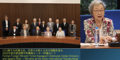 川口順子元外務大臣、世界の分断と日本の課題を語る ― 京都国際平和構築センター評議会にて (26/09/2025) 2025-09-26 0 comment 2025年度京都国際平和構築センター評議会において、新たに評議員に就任した川口順子(かわぐちよりこ)元外務大臣が発言を行った。武蔵野大学国際… Read More >>