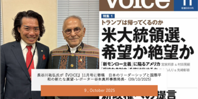 長谷川祐弘理事長が『VOICE』11月号に寄稿 日本のリーダーシップと国際平和の新たな展望 (09/10/2025) 2025-10-09 0 comment 日本国際平和構築協会(GPAJ)で事務局長を務めております谷本真邦です。このたび、当協会の長谷川祐弘理事長が、月刊誌『VOICE』2025年… Read More >>