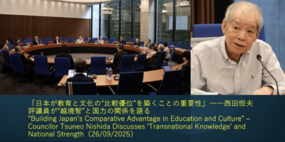 「日本が教育と文化の“比較優位”を築くことの重要性」――西田恒夫評議員が“越境智”と国力の関係を語る (26/09/2025) 2025-09-26 0 comment 京都国際平和構築センターの評議会において、同センター評議員であり元国際連合日本政府代表部特命全権大使の西田恒夫氏が、「越境智」と国家の比較優… Read More >>