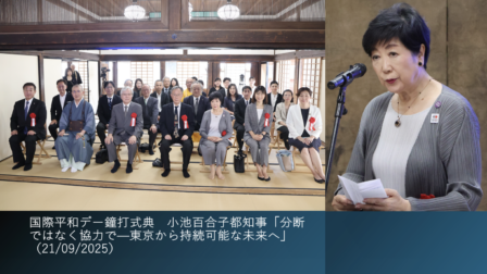 国際平和デー鐘打式典 小池百合子都知事「分断ではなく協力で—東京から持続可能な未来へ」(21/09/2025)