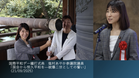 国際平和デー鐘打式典 塩村あやか参議院議員「国会から恒久平和を—被爆二世としての誓い」(21/09/2025)